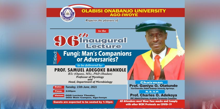 Olabisi Onabanjo University, Ago-Iwoye will on Tuesday, 15th June, 2021 hold its 96th Inaugural Lecture entitled “FUNGI: MAN’S COMPANIONS OR ADVERSARIES?” at the Otunba Gbenga Daniel Lecture Theatre, Main Campus, Ago-Iwoye by 2.00p.m. The Lecture will be delivered by Professor Samuel Adegoke Bankole, a Professor of Mycology, under the distinguished Chairmanship of the Vice-Chancellor, Professor […]