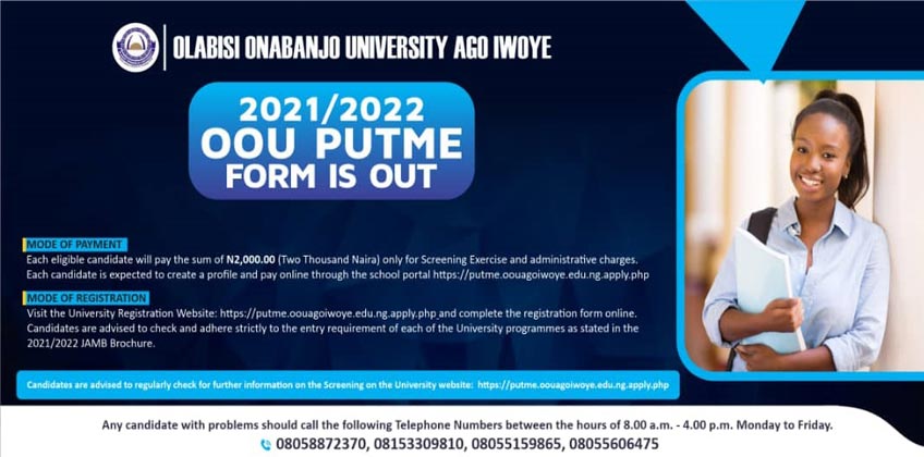 The Management of Olabisi Onabanjo University, Ago-Iwoye wishes to inform all duly registered applicants for admission into the University for the 2021/2022 Academic Session that the PUTME Screening Exercise will hold from Monday 20th to Wednesday 22nd December 2021 at the University ICT Centre, Main Campus, Ago-Iwoye. Applicants are advised to check their respective portal/mail […]