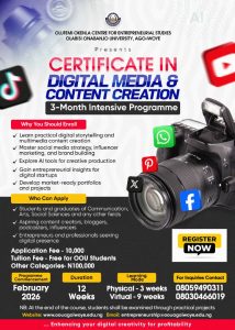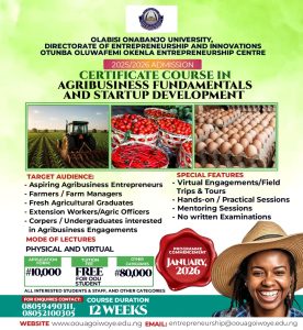 The Short Certificate Courses on Entrepreneurship and Innovation, as approved by the University’s Senate, were conceived as part of Olabisi Onabanjo University’s strategic commitment to youth empowerment, employability, and sustainable development. Recognising the growing challenges of unemployment and the need for innovation-driven economic growth, the University developed these courses to complement formal degree programmes. The initiative builds on OOU’s longstanding tradition of academic excellence and community engagement, integrating practical entrepreneurship training, innovation management, and emerging industry trends. Over time, the programme has evolved to address contemporary challenges, incorporating digital skills, creative enterprise, and technology-driven solutions relevant to Nigeria and the global marketplace.