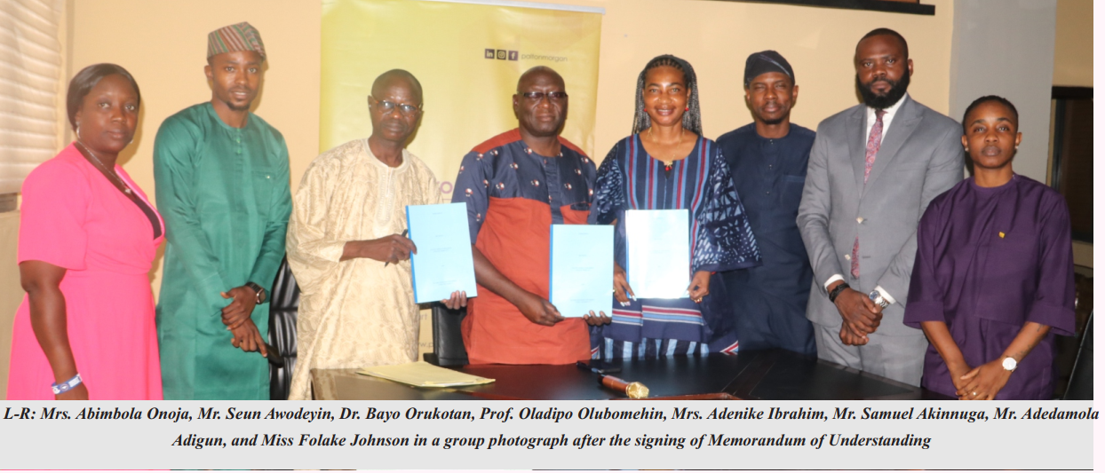 Present at the signing ceremony were the Registrar, Dr. Bayo Orukotan, and the University’s Legal Officer, Mrs. Abimbola Onoja. Also in attendance were officials of Palton Morgan Holdings, including Mr. Adedamola Adigun, Technical Assistant to the Group Managing Director; Miss Folake Johnson, Head of Marketing; and Mr. Seun Awodeyin, Marketing Officer.